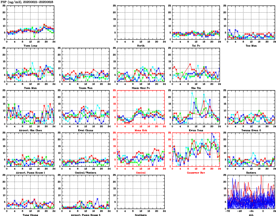 | Air Quality Data Time Series for FSP (2020/06/18) | ( Line colors: Day -3 Day -2 Day -1 Current day ) | 2D Map Current AQHI |
