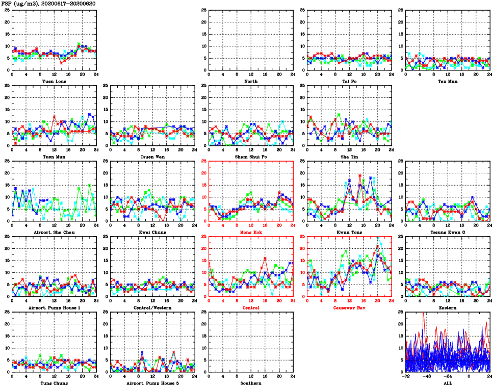 | Air Quality Data Time Series for FSP (2020/06/20) | ( Line colors: Day -3 Day -2 Day -1 Current day ) | 2D Map Current AQHI |
