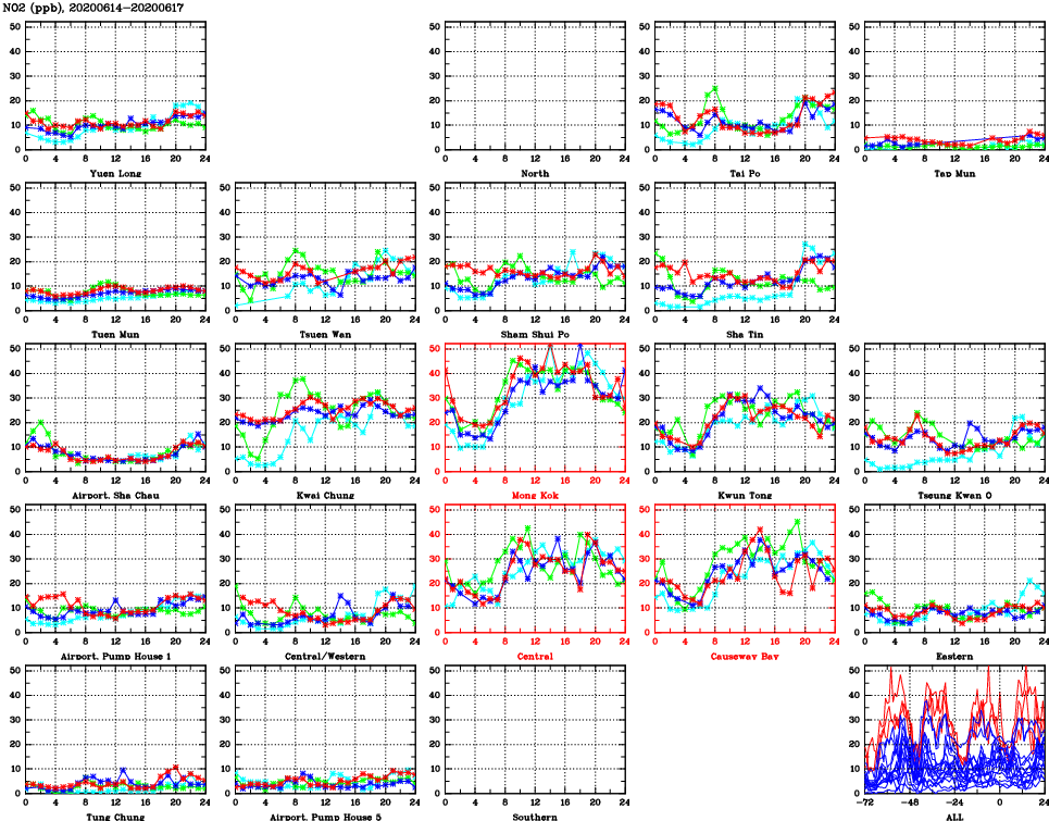 | Air Quality Data Time Series for NO2 (2020/06/17) | ( Line colors: Day -3 Day -2 Day -1 Current day ) | 2D Map Current AQHI |