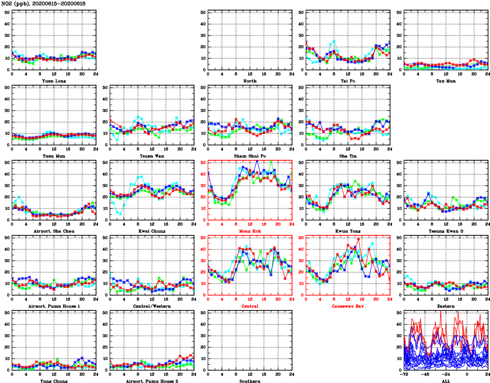 | Air Quality Data Time Series for NO2 (2020/06/18) | ( Line colors: Day -3 Day -2 Day -1 Current day ) | 2D Map Current AQHI |