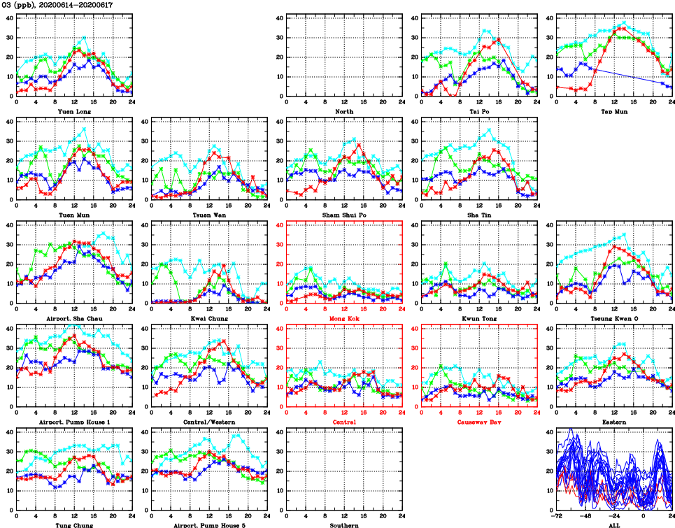 | Air Quality Data Time Series for O3 (2020/06/17) | ( Line colors: Day -3 Day -2 Day -1 Current day ) | 2D Map Current AQHI |