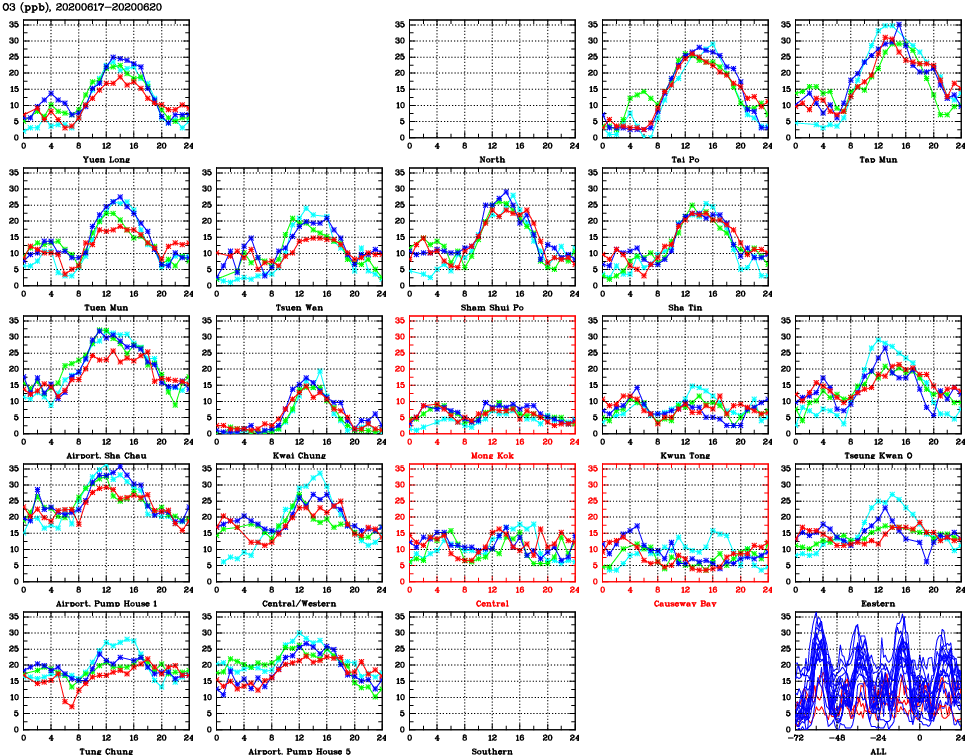 | Air Quality Data Time Series for O3 (2020/06/20) | ( Line colors: Day -3 Day -2 Day -1 Current day ) | 2D Map Current AQHI |