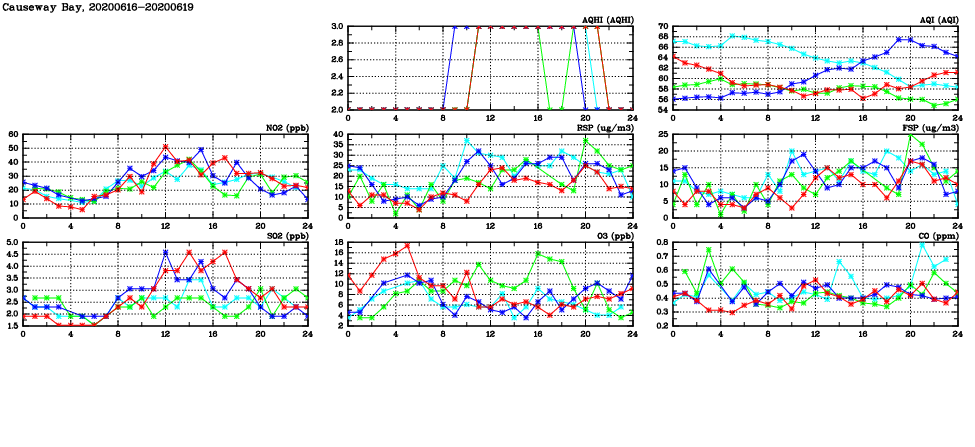 | Air Quality Data Time Series in Causeway Bay (2020/06/19) | ( Line colors: Day -3 Day -2 Day -1 Current day ) | 2D Map Current AQHI |