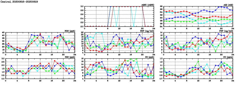 | Air Quality Data Time Series in Central (2020/06/19) | ( Line colors: Day -3 Day -2 Day -1 Current day ) | 2D Map Current AQHI |