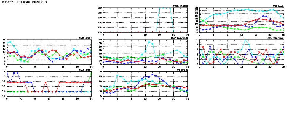 | Air Quality Data Time Series in Eastern (2020/06/18) | ( Line colors: Day -3 Day -2 Day -1 Current day ) | 2D Map Current AQHI |