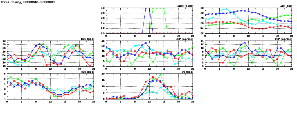 | Air Quality Data Time Series in Kwai Chung (2020/06/19) | ( Line colors: Day -3 Day -2 Day -1 Current day ) | 2D Map Current AQHI |