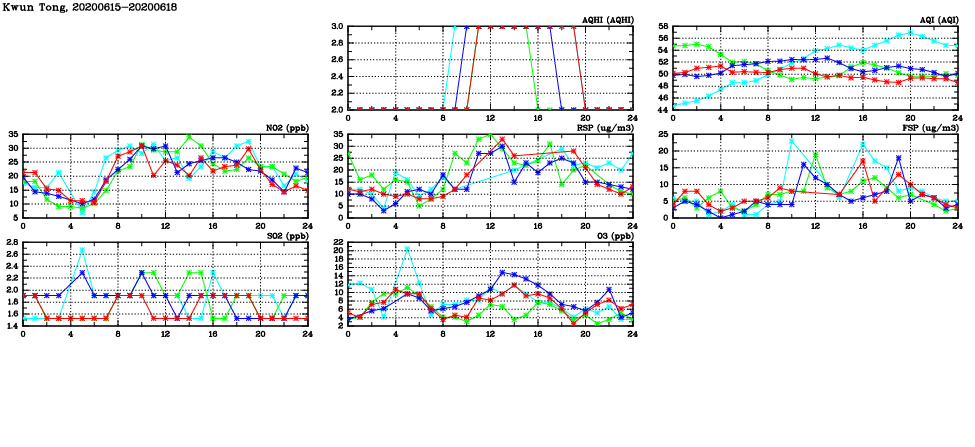 | Air Quality Data Time Series in Kwun Tong (2020/06/18) | ( Line colors: Day -3 Day -2 Day -1 Current day ) | 2D Map Current AQHI |