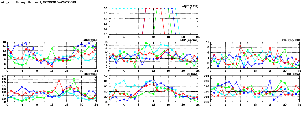 | Air Quality Data Time Series in Airport, Pump House 1 (2020/06/18) | ( Line colors: Day -3 Day -2 Day -1 Current day ) | 2D Map Current AQHI |