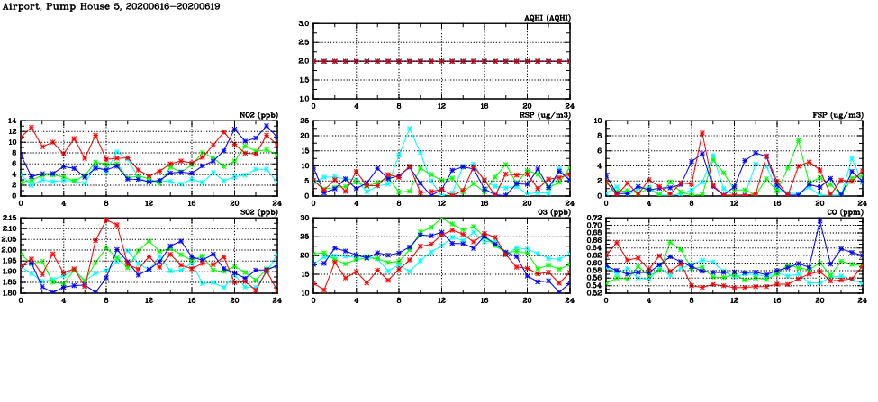 | Air Quality Data Time Series in Airport, Pump House 5 (2020/06/19) | ( Line colors: Day -3 Day -2 Day -1 Current day ) | 2D Map Current AQHI |