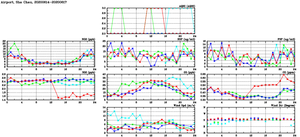 | Air Quality Data Time Series in Airport, Sha Chau (2020/06/17) | ( Line colors: Day -3 Day -2 Day -1 Current day ) | 2D Map Current AQHI |