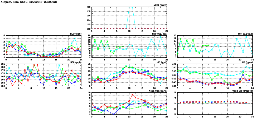 | Air Quality Data Time Series in Airport, Sha Chau (2020/06/21) | ( Line colors: Day -3 Day -2 Day -1 Current day ) | 2D Map Current AQHI |