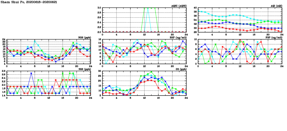 | Air Quality Data Time Series in Sham Shui Po (2020/06/21) | ( Line colors: Day -3 Day -2 Day -1 Current day ) | 2D Map Current AQHI |