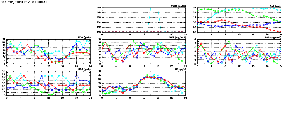 | Air Quality Data Time Series in Sha Tin (2020/06/20) | ( Line colors: Day -3 Day -2 Day -1 Current day ) | 2D Map Current AQHI |