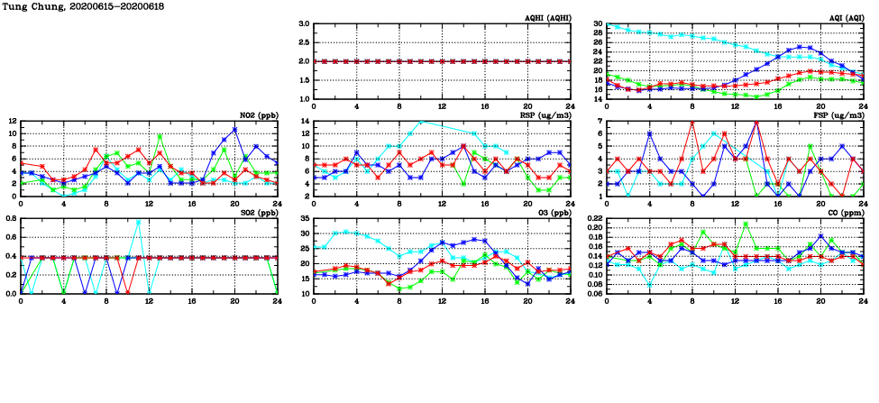 | Air Quality Data Time Series in Tung Chung (2020/06/18) | ( Line colors: Day -3 Day -2 Day -1 Current day ) | 2D Map Current AQHI |