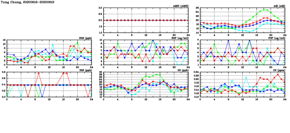 | Air Quality Data Time Series in Tung Chung (2020/06/19) | ( Line colors: Day -3 Day -2 Day -1 Current day ) | 2D Map Current AQHI |