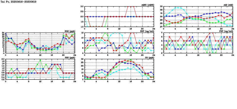 | Air Quality Data Time Series in Tai Po (2020/06/19) | ( Line colors: Day -3 Day -2 Day -1 Current day ) | 2D Map Current AQHI |