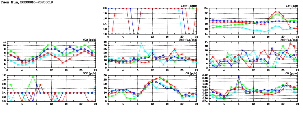 | Air Quality Data Time Series in Tuen Mun (2020/06/19) | ( Line colors: Day -3 Day -2 Day -1 Current day ) | 2D Map Current AQHI |