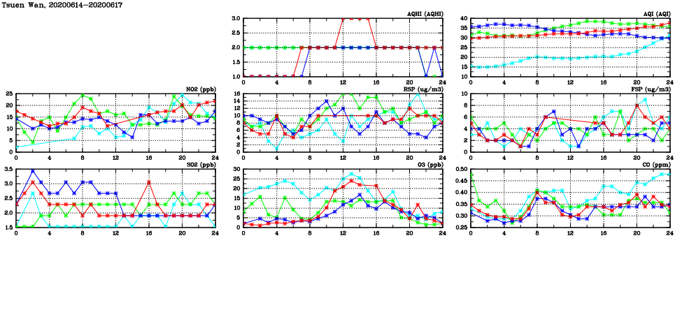 | Air Quality Data Time Series in Tsuen Wan (2020/06/17) | ( Line colors: Day -3 Day -2 Day -1 Current day ) | 2D Map Current AQHI |