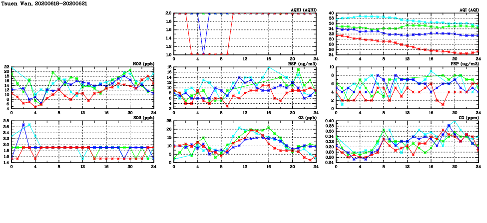 | Air Quality Data Time Series in Tsuen Wan (2020/06/21) | ( Line colors: Day -3 Day -2 Day -1 Current day ) | 2D Map Current AQHI |