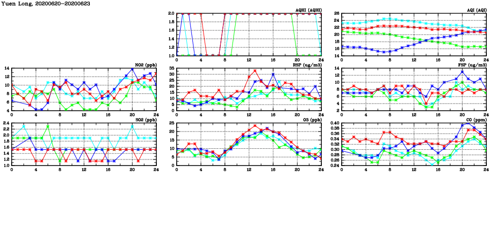 | Air Quality Data Time Series in Yuen Long (2020/06/23) | ( Line colors: Day -3 Day -2 Day -1 Current day ) | 2D Map Current AQHI |