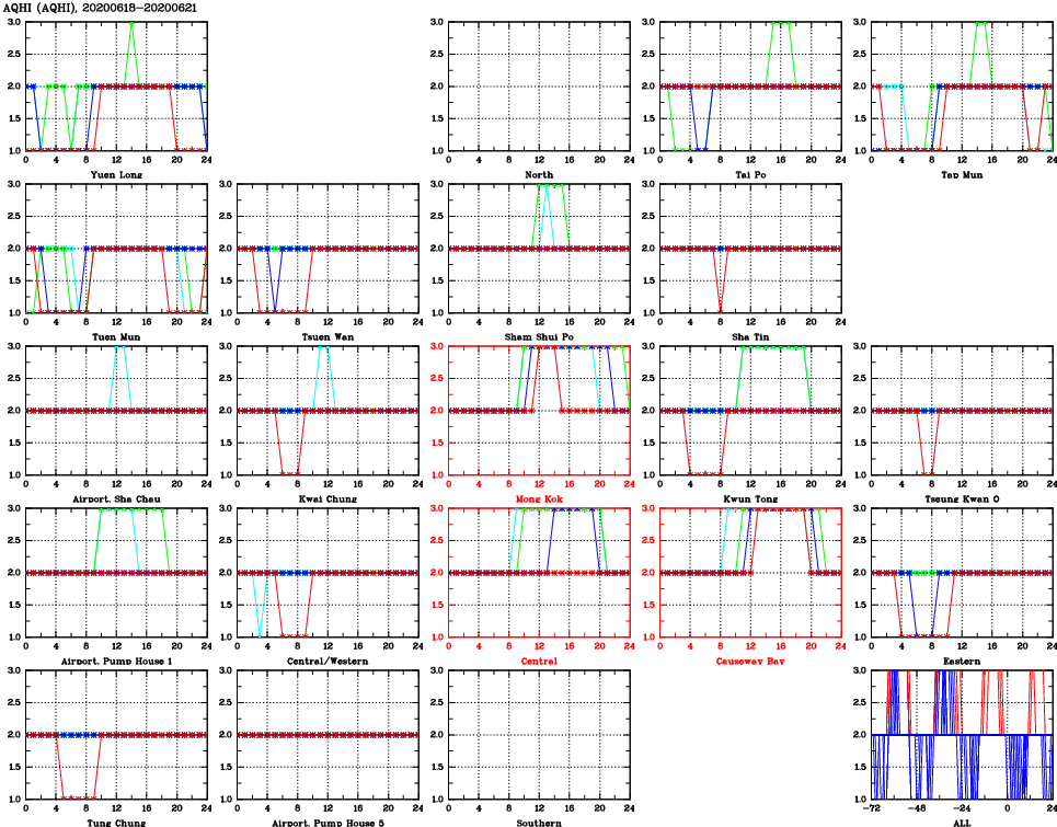 | Air Quality Data Time Series for AQHI (2020/06/21) | ( Line colors: Day -3 Day -2 Day -1 Current day ) | 2D Map Current AQHI |