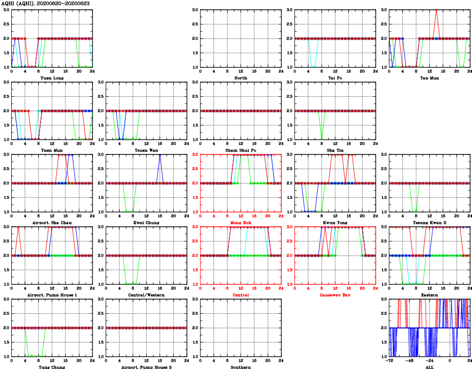 | Air Quality Data Time Series for AQHI (2020/06/23) | ( Line colors: Day -3 Day -2 Day -1 Current day ) | 2D Map Current AQHI |