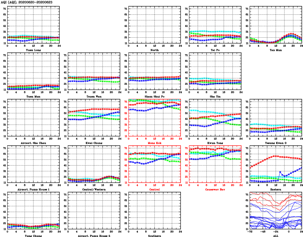 | Air Quality Data Time Series for AQI (2020/06/23) | ( Line colors: Day -3 Day -2 Day -1 Current day ) | 2D Map Current AQHI |
