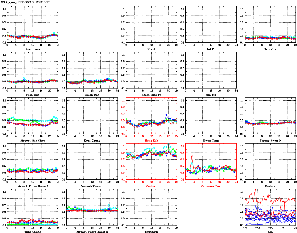 | Air Quality Data Time Series for CO (2020/06/21) | ( Line colors: Day -3 Day -2 Day -1 Current day ) | 2D Map Current AQHI |