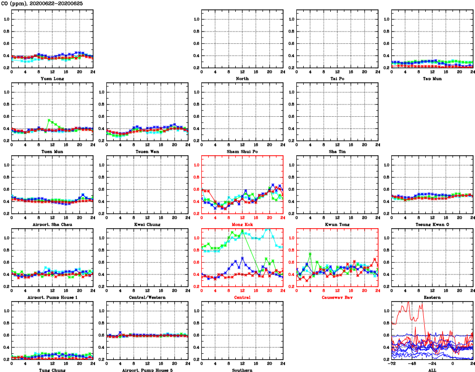 | Air Quality Data Time Series for CO (2020/06/25) | ( Line colors: Day -3 Day -2 Day -1 Current day ) | 2D Map Current AQHI |