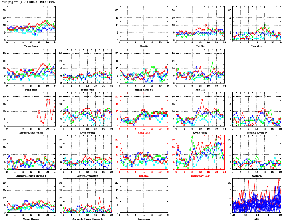 | Air Quality Data Time Series for FSP (2020/06/24) | ( Line colors: Day -3 Day -2 Day -1 Current day ) | 2D Map Current AQHI |