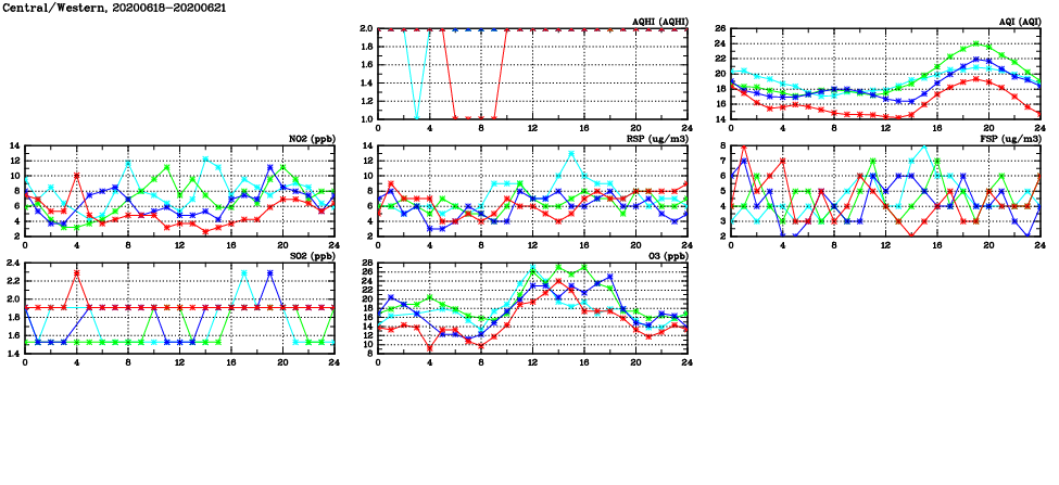 | Air Quality Data Time Series in Central/Western (2020/06/21) | ( Line colors: Day -3 Day -2 Day -1 Current day ) | 2D Map Current AQHI |