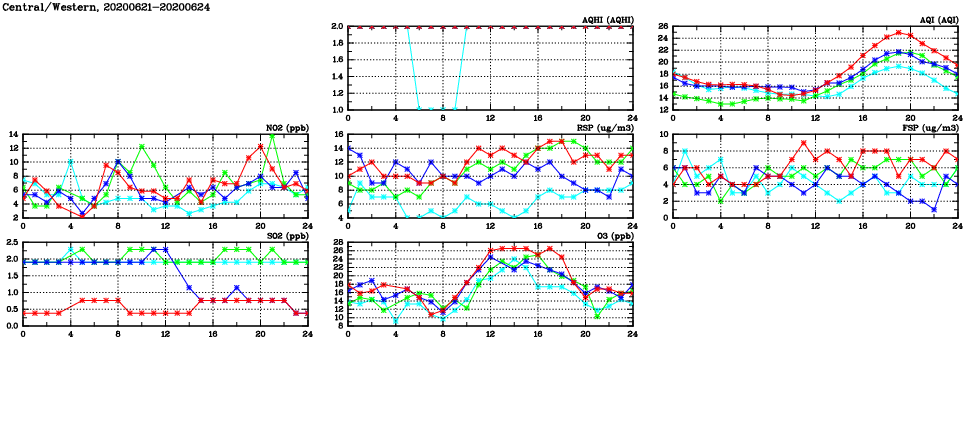 | Air Quality Data Time Series in Central/Western (2020/06/24) | ( Line colors: Day -3 Day -2 Day -1 Current day ) | 2D Map Current AQHI |
