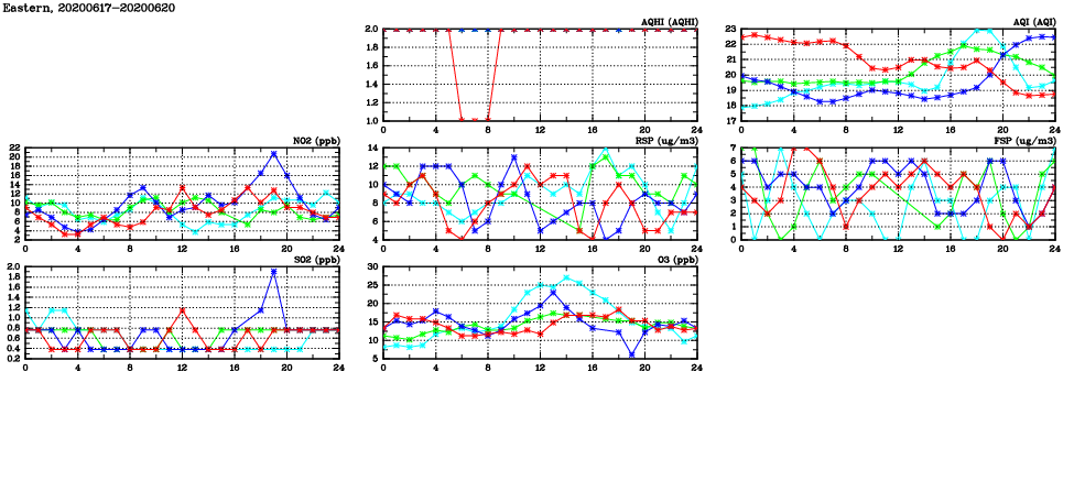 | Air Quality Data Time Series in Eastern (2020/06/20) | ( Line colors: Day -3 Day -2 Day -1 Current day ) | 2D Map Current AQHI |