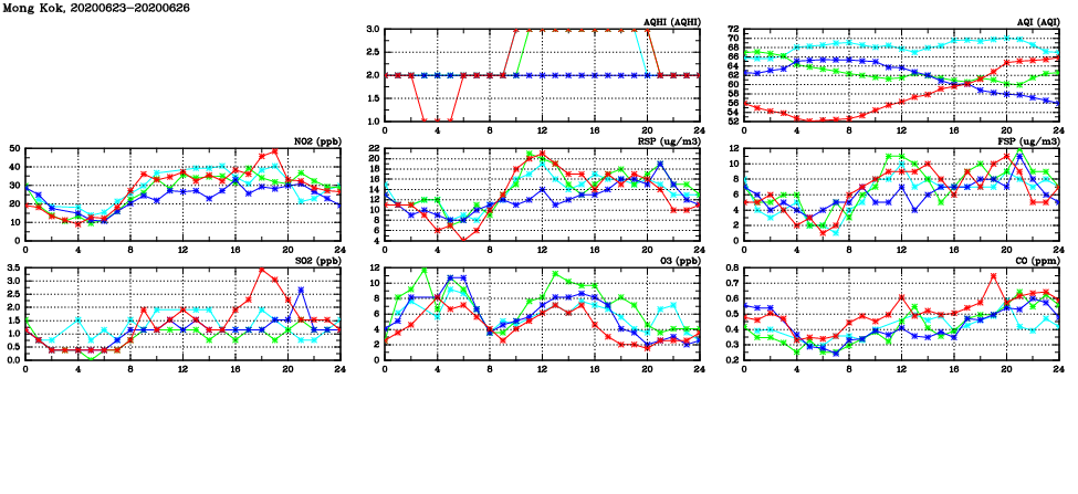 | Air Quality Data Time Series in Mong Kok (2020/06/26) | ( Line colors: Day -3 Day -2 Day -1 Current day ) | 2D Map Current AQHI |