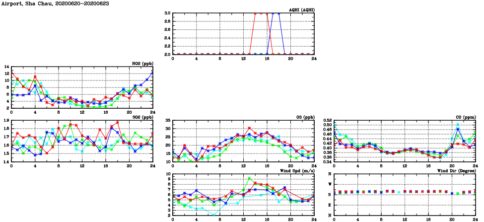 | Air Quality Data Time Series in Airport, Sha Chau (2020/06/23) | ( Line colors: Day -3 Day -2 Day -1 Current day ) | 2D Map Current AQHI |