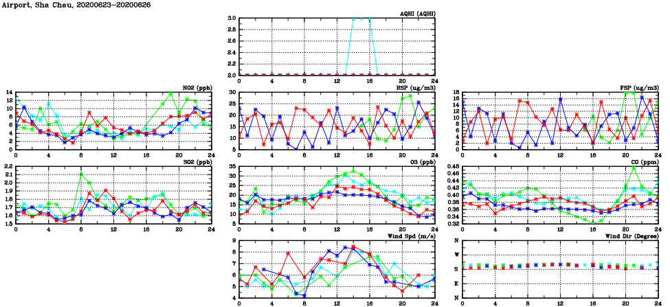 | Air Quality Data Time Series in Airport, Sha Chau (2020/06/26) | ( Line colors: Day -3 Day -2 Day -1 Current day ) | 2D Map Current AQHI |