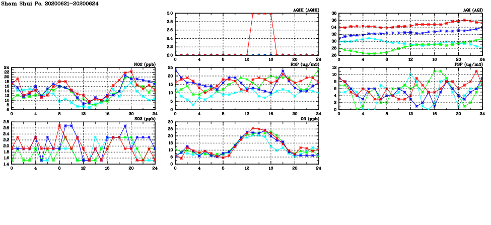 | Air Quality Data Time Series in Sham Shui Po (2020/06/24) | ( Line colors: Day -3 Day -2 Day -1 Current day ) | 2D Map Current AQHI |