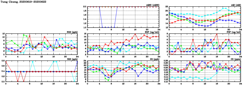 | Air Quality Data Time Series in Tung Chung (2020/06/22) | ( Line colors: Day -3 Day -2 Day -1 Current day ) | 2D Map Current AQHI |