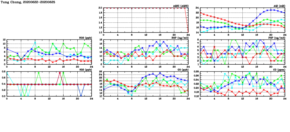 | Air Quality Data Time Series in Tung Chung (2020/06/25) | ( Line colors: Day -3 Day -2 Day -1 Current day ) | 2D Map Current AQHI |