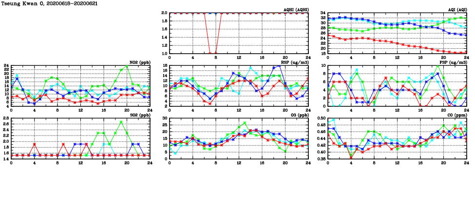 | Air Quality Data Time Series in Tseung Kwan O (2020/06/21) | ( Line colors: Day -3 Day -2 Day -1 Current day ) | 2D Map Current AQHI |