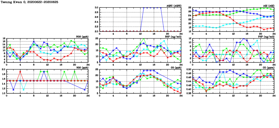 | Air Quality Data Time Series in Tseung Kwan O (2020/06/25) | ( Line colors: Day -3 Day -2 Day -1 Current day ) | 2D Map Current AQHI |