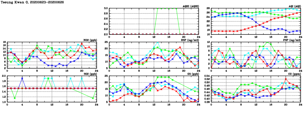 | Air Quality Data Time Series in Tseung Kwan O (2020/06/26) | ( Line colors: Day -3 Day -2 Day -1 Current day ) | 2D Map Current AQHI |