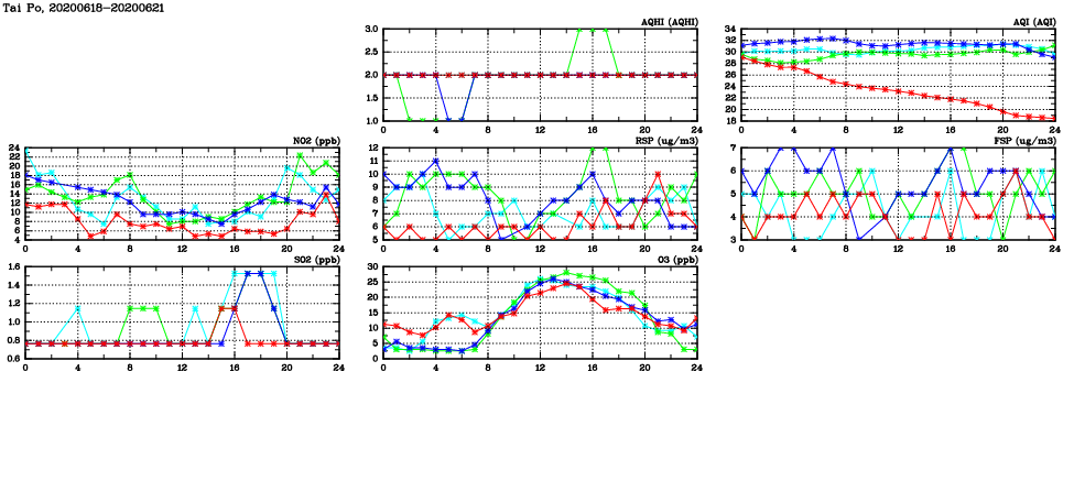 | Air Quality Data Time Series in Tai Po (2020/06/21) | ( Line colors: Day -3 Day -2 Day -1 Current day ) | 2D Map Current AQHI |