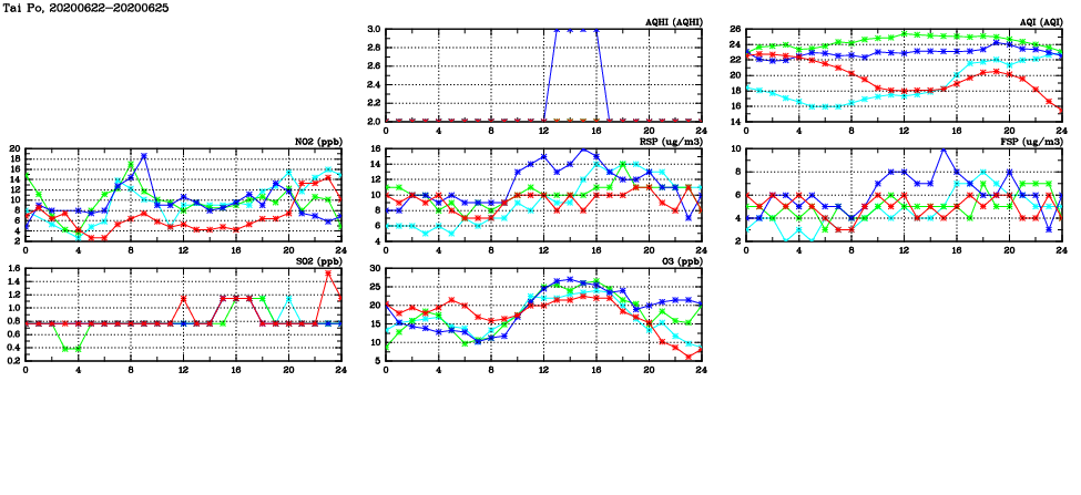 | Air Quality Data Time Series in Tai Po (2020/06/25) | ( Line colors: Day -3 Day -2 Day -1 Current day ) | 2D Map Current AQHI |
