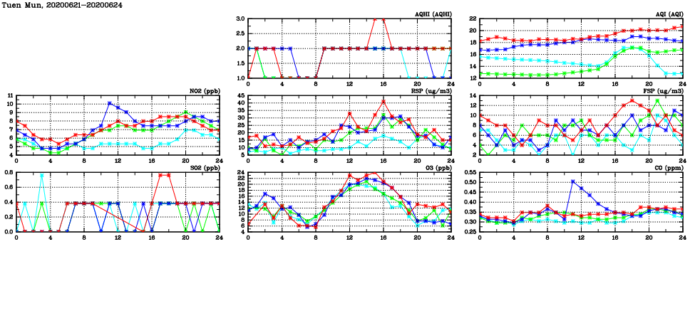 | Air Quality Data Time Series in Tuen Mun (2020/06/24) | ( Line colors: Day -3 Day -2 Day -1 Current day ) | 2D Map Current AQHI |