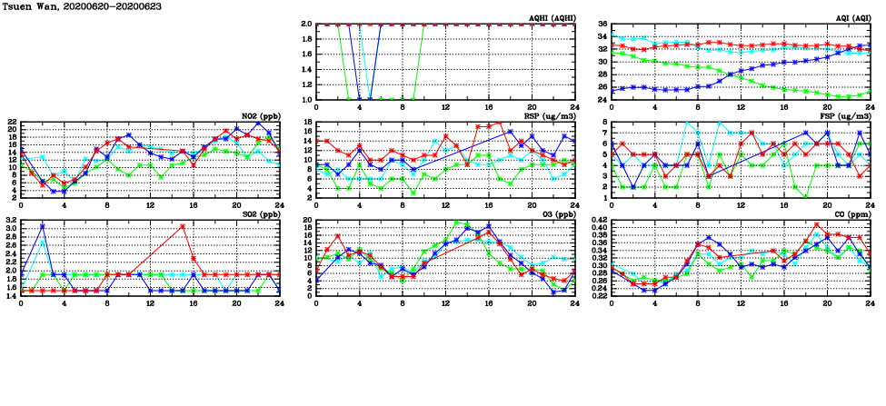 | Air Quality Data Time Series in Tsuen Wan (2020/06/23) | ( Line colors: Day -3 Day -2 Day -1 Current day ) | 2D Map Current AQHI |