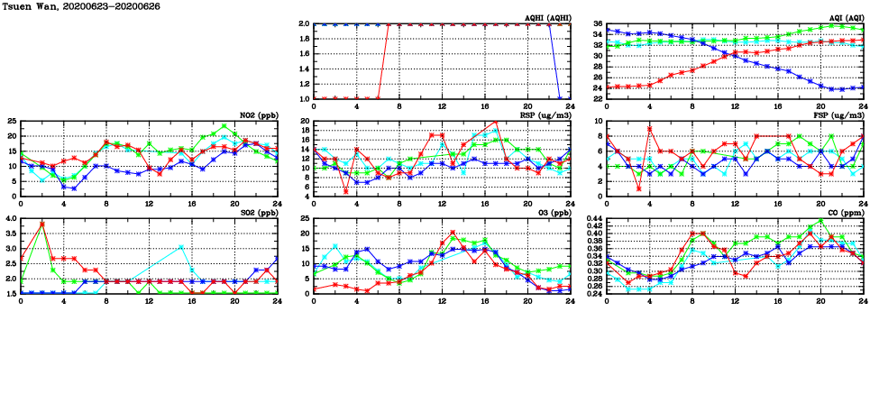 | Air Quality Data Time Series in Tsuen Wan (2020/06/26) | ( Line colors: Day -3 Day -2 Day -1 Current day ) | 2D Map Current AQHI |