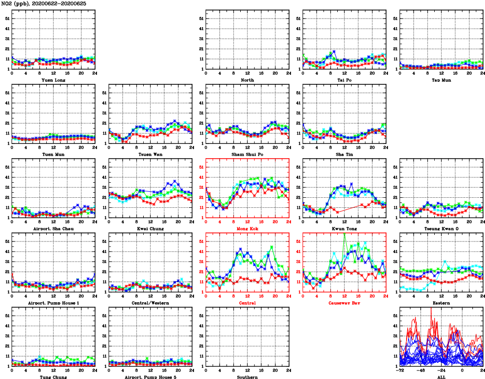 | Air Quality Data Time Series for NO2 (2020/06/25) | ( Line colors: Day -3 Day -2 Day -1 Current day ) | 2D Map Current AQHI |