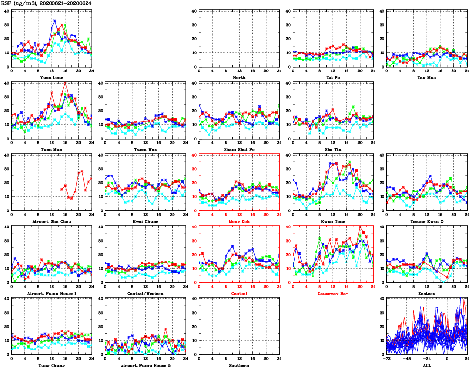 | Air Quality Data Time Series for RSP (2020/06/24) | ( Line colors: Day -3 Day -2 Day -1 Current day ) | 2D Map Current AQHI |