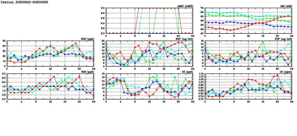 | Air Quality Data Time Series in Central (2020/06/22) | ( Line colors: Day -3 Day -2 Day -1 Current day ) | 2D Map Current AQHI |